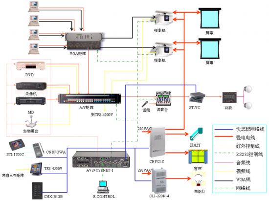 A/V系統(tǒng)由4臺(tái)計(jì)算機(jī)、攝像機(jī)、DVD、VCR(錄像機(jī))、MD機(jī)、實(shí)物展臺(tái)、調(diào)音臺(tái)、話筒、功放、音箱、數(shù)字硬碟錄像機(jī)等A/V設(shè)備構(gòu)成。