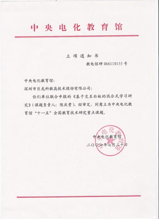 日前,由中央電化教育館、深圳市巨龍科教高技術(shù)股份有限公司聯(lián)合申報(bào)的《基于交互白板的混合式學(xué)習(xí)研究》,經(jīng)審定,同意立為中央電化教育館“十一五”全國教育技術(shù)研究重點(diǎn)課題。