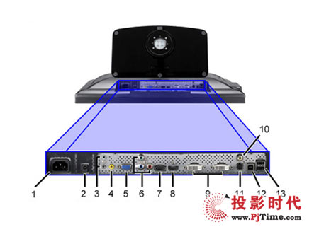 (圖中數(shù)字所標(biāo)識(shí)的接口分別是:1.電源;2.外置音箱電源;3和4.音頻輸入和輸出接口;5.D-Sub接口;6.色差接口;7.DisplayPort接口;8.HDMI接口;9.雙DVI-D接口;10.AV視頻接口;11.S端子;12.上行USB接口;13.兩個(gè)下行USB接口)
