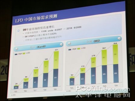 三星顯示器營(yíng)銷部產(chǎn)品經(jīng)理崔南極先生表示:LFD(Large Format Display)產(chǎn)品在09年之前仍然會(huì)保持持續(xù)高速增長(zhǎng)狀態(tài),在中國(guó)市場(chǎng),LFD(Large Format Display)產(chǎn)品將會(huì)由07年的116K數(shù)量需求增長(zhǎng)至09年221K的數(shù)量需求。而LCD(液晶顯示器)將會(huì)逐漸取代PDP(等離子顯示器)成為市場(chǎng)主流大屏產(chǎn)品。