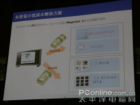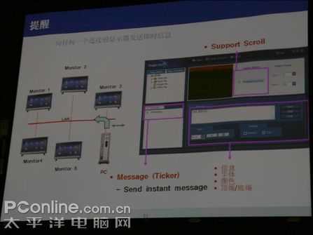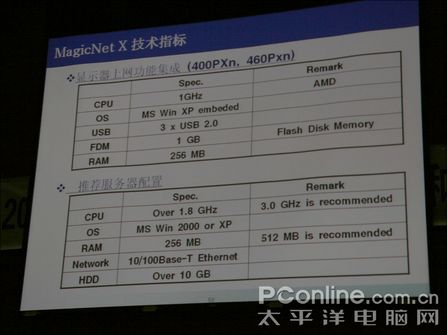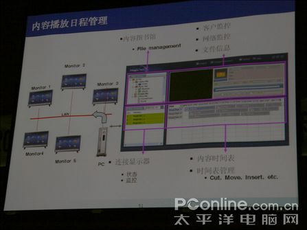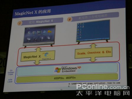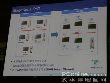 簡單表示:支持MagicNet技術(shù)的顯示器內(nèi)部集成一個windows Embedded系統(tǒng),我們可以利用網(wǎng)線連接,通過一臺服務(wù)器對支持MagicNet X技術(shù)顯示器進(jìn)行播放控制,而無需為每臺顯示器配備額外的計算機終端。