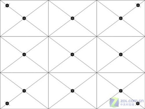 測試亮度、全白全黑對比度時我們使用ANSI和ISO21118標(biāo)準(zhǔn)采用的九點方法,均勻分布在屏幕九個測試點上的照度的平均值就是屏幕的平均照度。而均勻性測試我們還參照ANSI標(biāo)準(zhǔn)增加了角落處的四個點,這里是投影機最容易變暗的地方。