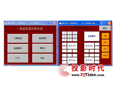 大樓的所有監(jiān)控信號(hào)經(jīng)監(jiān)控矩陣自由切至硬盤錄像機(jī)、監(jiān)視墻、大樓設(shè)置多個(gè)可控云臺(tái)攝像機(jī),由監(jiān)控系統(tǒng)鍵盤自由切換矩陣信號(hào)、云臺(tái)攝像機(jī)。一層另一主要功能負(fù)責(zé)大廳的演示信號(hào),由九塊歐麗安大屏拼接成3X3、65寸等離子、DVD、DBX音視數(shù)字處理器、AV0404視頻矩陣組成,由中控及ST7600無線觸屏集中控制。