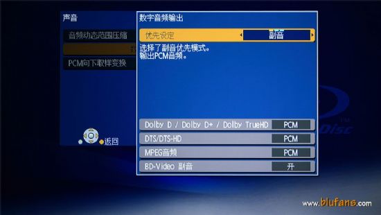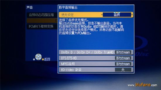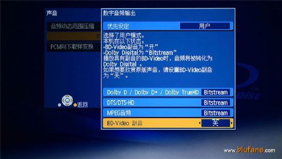 有副音、音質(zhì)、用戶三個設置組合,一般就使用用戶設置即可。DTS-HD與Dolby TrueHD當然選擇Bitstream(源碼)輸出;BD-Video副音配合Picture-in-Picture功能,可以設置為關,需要使用畫中畫功能時候隨時打開即可,具體操作方法后面會有詳細介紹。