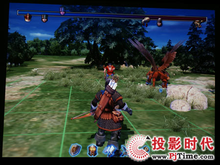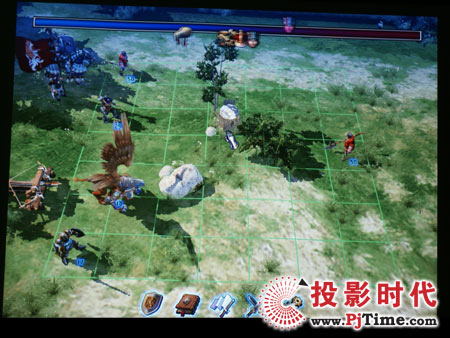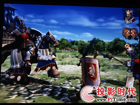 游戲畫面具有色彩簡單,色彩過渡細(xì)節(jié)較好,但是整體色彩分布幾何性較強(qiáng)。在顯示這種畫面時對投影機(jī)畫面平滑性的控制、色彩過渡的控制均有較高要求。實際測試中,MP512ST的效果完全超乎我們的想像,不僅色彩艷麗、細(xì)節(jié)豐富,而且畫面的細(xì)膩感非常出眾,大屏游戲的震撼效果被表現(xiàn)的淋漓盡致。