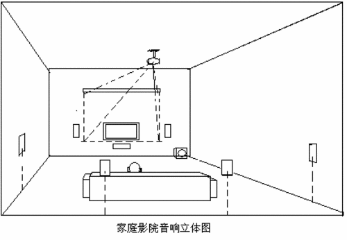 (3)側(cè)環(huán)繞音箱擺位采用“側(cè)墻安裝法””為最佳,就是把兩只環(huán)繞音箱面對(duì)面指向,放在與聽音者等距離的兩側(cè)墻上。并使其比聽音者高60~100cm。若室內(nèi)限制無(wú)鄰近側(cè)墻的,可以把環(huán)繞音箱放在地面支架上,安裝方法與”側(cè)墻安裝法”相同。