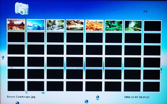 圖片瀏覽功能擁有完善的縮略圖功能,而圖片內(nèi)容上我們采用了Vista操作系統(tǒng)內(nèi)置的一些大分辨率壁紙,不得不說這款產(chǎn)品的處理能力是非常強勁的,在圖片加載到內(nèi)存完畢之后,無論是快速翻頁,還是幻燈片功能,響應速度都很快。