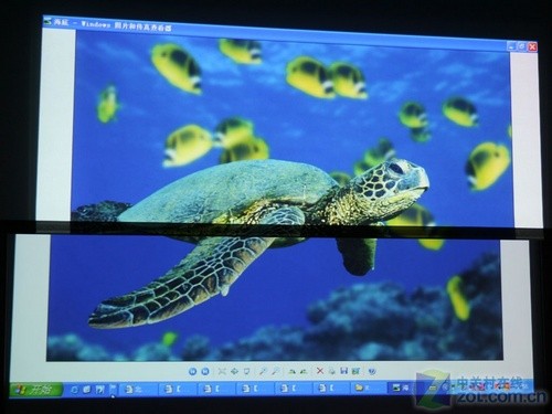 如果細(xì)加分辨,我們就能看到處于下方的優(yōu)質(zhì)幕布的畫質(zhì)要高于上方的普通幕布。比如說在第一張圖片中,下圖中的藍(lán)色更加飽和純凈,海龜?shù)啮挔钏闹哺忧逦I戏侥徊加捎诓馁|(zhì)一般,具有高增益的特點(diǎn),所以畫面更亮,甚至失去了畫面本來所具有的魅力。在第二張圖片中的綠色中我們也可以看到,上圖中的綠色雖然更亮,但是顯然沒有下圖中的綠色飽和程度高。