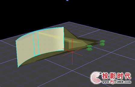 本方案采用4臺的DLP投影機夏普 XG-MB65XA  XGA,每2臺投影機組成一個通道,產(chǎn)生被動立體效果。相鄰通道的投影機之間采用硬件邊融合和非線性幾何校正技術,組成一套無縫拼接的寬屏投影顯示系統(tǒng),60度環(huán)形金屬投影硬幕,尺寸為弧長6.3 米(弦長6米),高2.4米,半徑6米,重疊區(qū)0.6米的無縫柱形屏幕上。