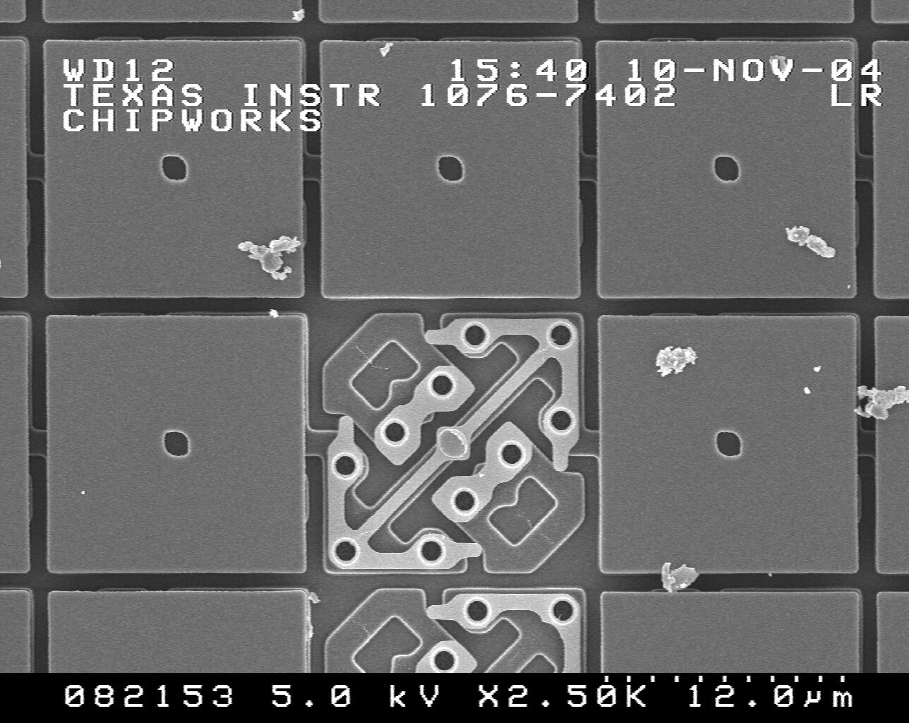圖2是從封裝中取出的裸片的照片,該器件使用了五個金屬層,三個用于CMOS電路,兩個用于MEMS上層部分。裸片邊緣的紫色部分是第三金屬層(M3),上面覆蓋有一層薄的氧化物,經(jīng)過調(diào)整使其盡量不反射光線,該層用于遮擋地址線路。我們的照片是將多個圖像組合在一起而得到的拼接效果圖。