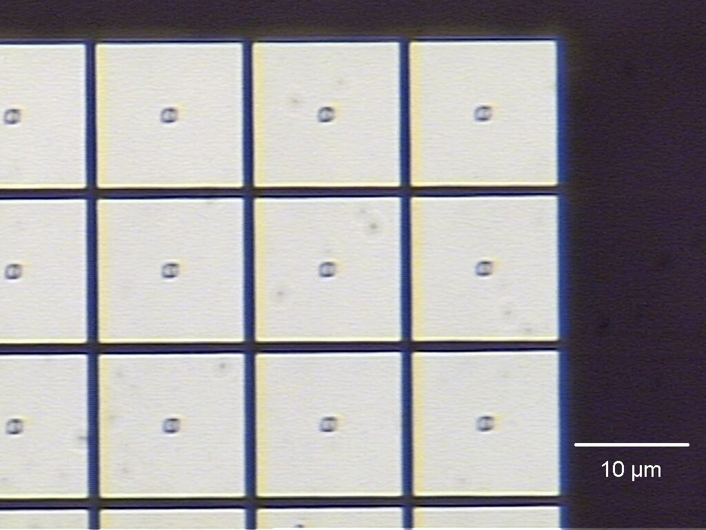 圖3顯示了微鏡數(shù)組的一角,每個鏡12.7 μm見方,間距為13.7 μm。每個鏡中央的暗點是支撐點,連在下面扭動的轉(zhuǎn)動點上。圖4是M5上微鏡的SEM圖像,其中有兩個鏡被拿掉了。