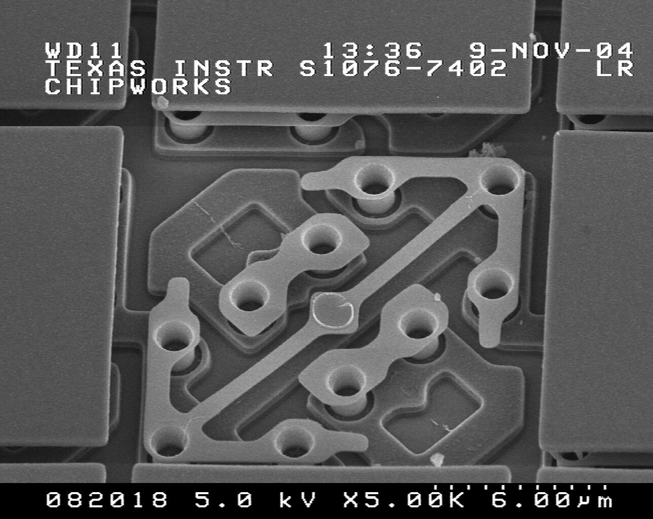 仔細觀察M4微鏡下面的金屬(圖5),可以發(fā)現(xiàn)扭動的轉(zhuǎn)動點呈對角排列,轉(zhuǎn)動點支撐每個像素的右上角和左下角,并從下面連到M3。第三金屬層的線從像素的左手和右手邊連接到相鄰像素上,使每行微鏡發(fā)生偏轉(zhuǎn)。微鏡地址電路在轉(zhuǎn)動點的任一邊,同樣連到M3上。
