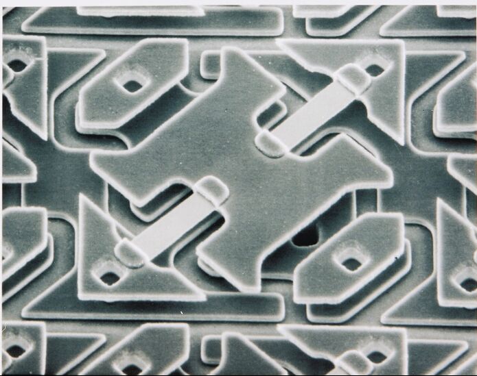 M4轉(zhuǎn)動層和M5微鏡層都是在犧牲氧化層上通過沉積工藝完成,這在SEM圖片上并不明顯,但是數(shù)組中的M3也覆蓋了同樣一層薄的氧化物作為外圍金屬,這種“暗金屬”可用來防止當微鏡關閉時偏光照射到屏幕上。據(jù)說這樣可將對比度從800:1提高到超過1500:1。