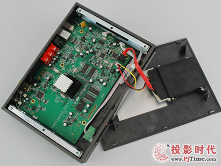 再來看下機器的主板正面,機器上的大部分主要芯片都設(shè)計在主板的正面,而且最為奇怪的是該機器采用了兩層散熱片,最后在跟廠房交談時才得知采用兩層散熱片時為了讓散熱片貼近機器的頂部金屬面板,這樣就更有利于機器內(nèi)部的散熱。同時,據(jù)介紹廠商已經(jīng)研發(fā)出新型的單塊散熱片,新的散熱片將直接貼緊頂部金屬面板。