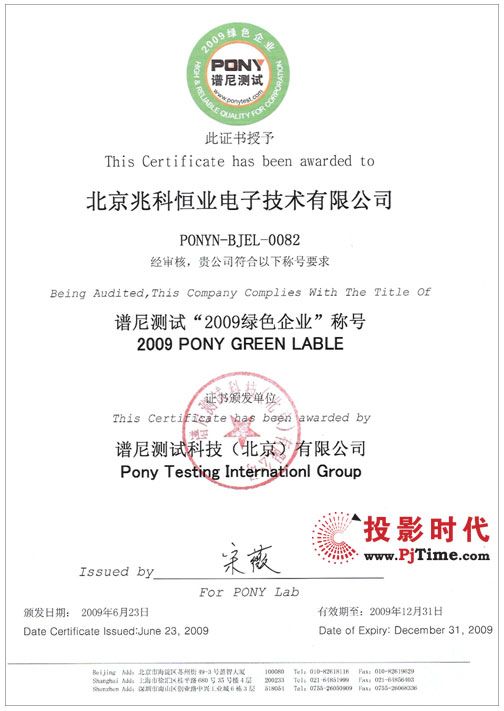 兆科電子榮獲譜尼測(cè)試“2009綠色企業(yè)”稱號(hào)