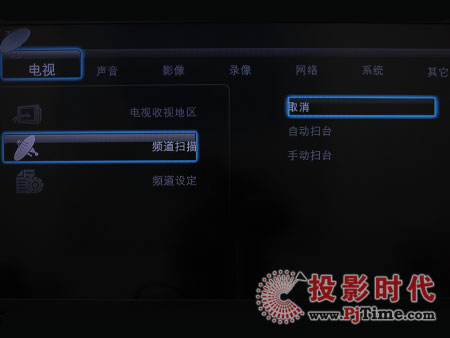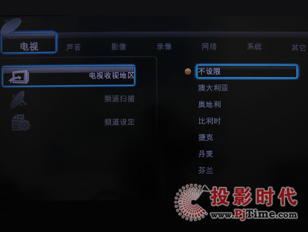 設(shè)置菜單有電視、聲音、影像、錄像、網(wǎng)絡(luò)、系統(tǒng)、其他幾個(gè)設(shè)置項(xiàng)。其中電視選項(xiàng)可以設(shè)置收視地區(qū)、頻道掃描、頻道設(shè)定。