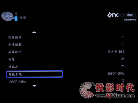 視頻設(shè)置菜單可以設(shè)定影片預(yù)覽、恢復(fù)播放、無(wú)縫播放、屏幕比例、亮度、對(duì)比度、電視系統(tǒng)、1080P 24Hz等。