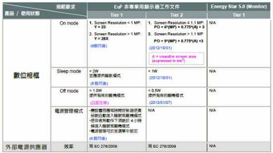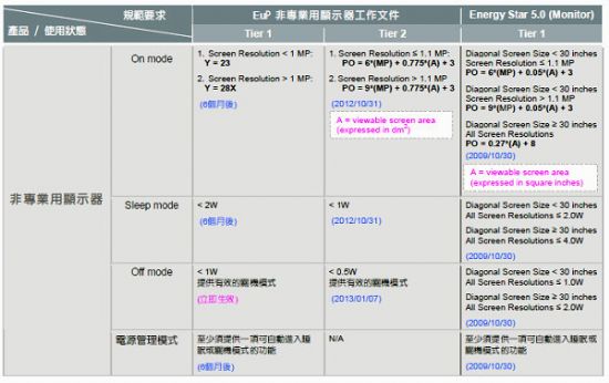 測試服務(wù)業(yè)者臺灣德國萊因(TUV)表示,有鑒于顯示器屏幕趨大化的態(tài)勢,美國Energy Star 5.0顯示器現(xiàn)行規(guī)范中亦將30~60英寸的顯示器納入規(guī)范,并且依照尺寸的不同,第一階段的生效日已陸續(xù)自2009年10月30日起適用(詳細(xì)內(nèi)容請對照下表)。在第二階段的要求方面,目前僅針對睡眠與關(guān)機模式進(jìn)行要求,開機模式的能效規(guī)范則無明確說明。