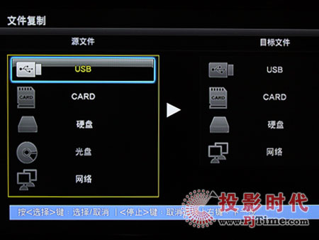 由主菜單文件復(fù)制子菜單進(jìn)入,可以在USB設(shè)備、存儲(chǔ)卡、硬盤、光盤、網(wǎng)絡(luò)存儲(chǔ)間進(jìn)行文件的復(fù)制等操作。