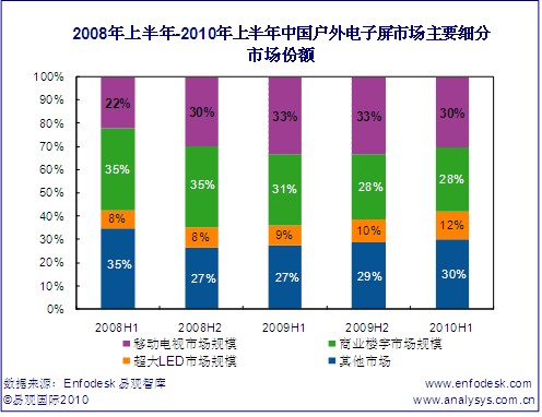 從細(xì)分市場(chǎng)來看,2010年上半年各細(xì)分市場(chǎng)所占比重排名與2009年下半年相同。2010年上半年中國(guó)戶外電子屏廣告主要細(xì)分市場(chǎng)狀況如下所示: