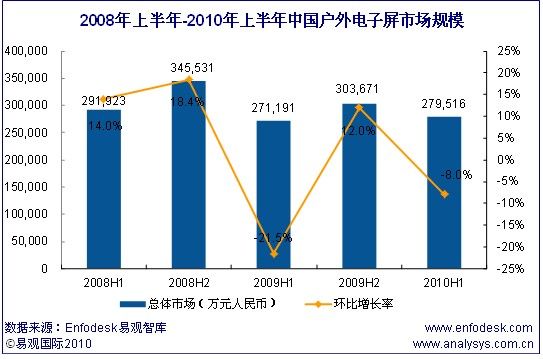 8月10日,第三方咨詢機(jī)構(gòu)易觀國(guó)際發(fā)布了中國(guó)互聯(lián)網(wǎng)行業(yè)半年核心數(shù)據(jù)。2010年上半年,中國(guó)戶外電子屏廣告市場(chǎng)規(guī)模達(dá)到27.9億元,環(huán)比下降8%,同比增長(zhǎng)3.1%。
