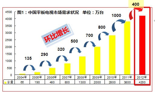 2011年中國彩電市場整體需求增長放緩,預計2012年需求量增長將至4200萬臺,整體增速繼續(xù)下降,市場整體環(huán)比增量預計400萬臺,是繼04年平板電視消費啟動發(fā)展以來的首次大幅下跌。