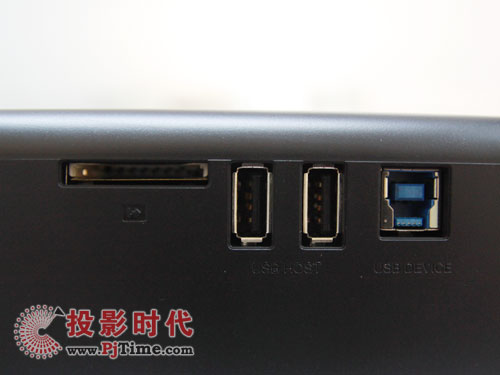 機身一側(cè)M900配備了SD卡槽,2個USB HOST接口,以及一個USB 3.0 Device接口,并隨機配送有USB 3.0線材,用戶可以方便地外接存儲卡、USB接口的硬盤、U盤等設(shè)備,實現(xiàn)高速傳輸和文件播放。并且,兩個USB接口之間留有足夠的空隙,即使同時插上兩個比較龐大的USB接口設(shè)備也不會沖突,真是非常貼心的設(shè)計。