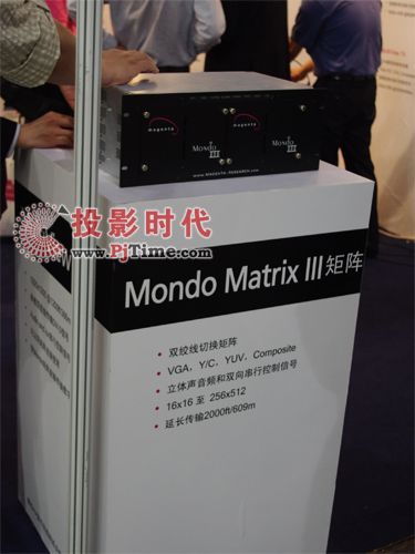 Mondo Matrix矩陣切換器支持VGA,YUV,Composite等格式,立體聲音頻和雙向 串行控制信號,其延長傳輸2000ft/609m。工作人員給我們介紹了很多,包括他們的特點及用途等等。