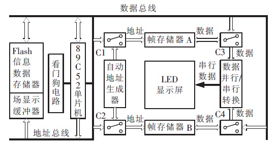 圖2是采用單片CPU設計的控制電路機構示意圖,用89C52單片機作為控制核心。單片機接收從PC機或其他信息源發(fā)送來的顯示數(shù)據(jù),存儲在Flash中,同時用RAM6264作為場顯示緩存區(qū),以實現(xiàn)不同顯示播出方式。89C52控制切換開關C1,C3和C2,C4同時對幀存儲器A,B交替進行數(shù)據(jù)的讀寫操作,將讀出的數(shù)據(jù)進行并行5串行轉換送給顯示屏進行顯示刷新。其中,自動地址生成器由4個計數(shù)器串聯(lián)構成,并配以振蕩電路提供計數(shù)時鐘,對于一個M×N個像素的單色屏,當刷新頻率為60Hz時,計數(shù)頻率為M×N×60Hz對于多灰度級彩色大屏幕,數(shù)據(jù)送到顯示屏之前要進行灰度調(diào)制重現(xiàn)圖像的色彩,對數(shù)據(jù)的處理速度要求更高,采用單片機控制可能在速度上無法滿足要求。