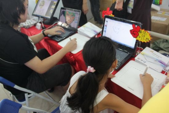 工作人員正在為動(dòng)漫愛好者講解凡拓?cái)?shù)位板