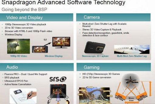 針對過去外界對Qualcomm處理芯片頗為詬病的“圖形顯示芯片性能較差,導(dǎo)致游戲性能不及對手”劣勢,Qualcomm也積極迎頭趕上。Snapdragon S4 系列芯片首款產(chǎn)品:換用Krait 新核心架構(gòu)的處理芯片MSM 8960將整合最新一代Adreno 225圖形處理內(nèi)核。根據(jù) Qualcomm官方文件數(shù)據(jù),Adreno 225芯片的性能相當(dāng)于Adreno 205的兩倍,其圖形處理能力應(yīng)與Apple iPad 2采用的PowerVR SGX543MP2圖形處理內(nèi)核相當(dāng),不但運算頻率提升到 400MHz、來自于臺積電的28納米等級晶圓制程工藝更有效提升了節(jié)能效果。目前所有 Adreno 2XX系列的圖形顯示核心均采用DirectX 9.0 格式,Qualcomm表示未來將在適當(dāng)?shù)臅r機推出擁有專利、支持 DirectX 11(D3D11)的圖形核心,屆時Adreno 225內(nèi)核的3D圖形顯示性能又將更上一層樓。