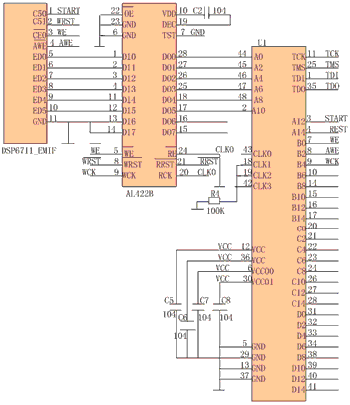 在本系統(tǒng)中,使用TMS320C6711的EMIF口的8位異步方式與CPLD一起定時(shí)刷新外部同步FIFOAL422B,接口電路如圖5所示。
