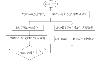 系統(tǒng)上電后復(fù)位CPLD、FIFO和TFT-LCD,DSP定時(shí)向FIFO寫入圖像數(shù)據(jù),CPLD并行的讀FIFO,同時(shí)驅(qū)動TFT-LCD逐像素顯示圖像,系統(tǒng)總流程如圖6所示。