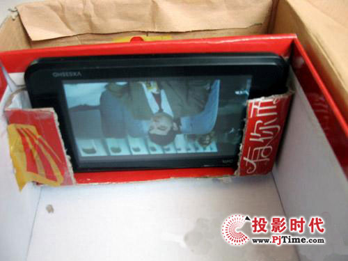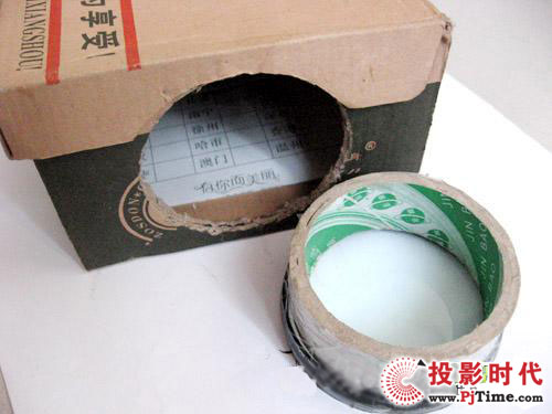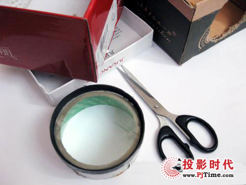 下面就要安裝投影儀的鏡頭了,在鞋盒里面安上一個(gè)用完的透明膠帶的紙環(huán),用膠條粘住,然后在將放大鏡粘在前面,這樣鏡頭就做好了。