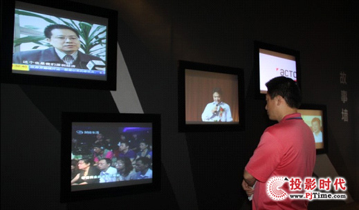 2012年第八屆中國(guó)(深圳)國(guó)際文化產(chǎn)業(yè)博覽交易會(huì)(以下簡(jiǎn)稱文博會(huì))雅圖展館大廳內(nèi),有一面的不規(guī)則灰黑主色調(diào)墻,墻上懸掛著五個(gè)幾何方體,方體內(nèi)是一張潔白的投影幕布,整體長(zhǎng)約80CM,寬約60CM,畫面上不斷地播放著關(guān)于雅圖的多類視頻,初看是液晶電視,細(xì)看發(fā)現(xiàn)黑色方塊內(nèi)是張白色投影幕布,讓人奇怪的是看到畫面從何而來(lái)?原來(lái),雅圖人是通過(guò)背投的方式將U盤和投影機(jī)相結(jié)合,從而快速地讓數(shù)據(jù)傳輸?shù)酵队澳徊迹挂曨l顯示效果更加清晰、飽滿。該故事墻主要展示雅圖人不畏困難、勇于進(jìn)取的企業(yè)發(fā)展精神及雅圖強(qiáng)大的自主創(chuàng)新技術(shù)研發(fā)實(shí)力和戰(zhàn)略規(guī)劃、愿景等內(nèi)容,雅圖人希望通過(guò)文博會(huì)這個(gè)平臺(tái),以投影機(jī)為載體,向觀眾展現(xiàn)一個(gè)立體的雅圖。