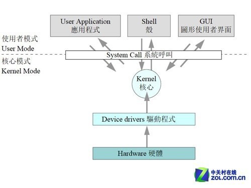 操作系統(tǒng)簡略架構(gòu)(圖片來自Wikipedia)