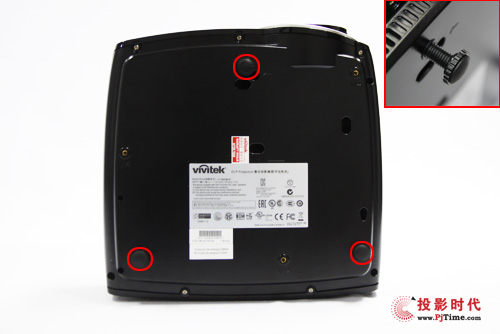 在機(jī)身底部,麗訊H1180CBHD依舊是傳統(tǒng)設(shè)計(jì),包括了支腳、吊裝支架孔、產(chǎn)品銘牌標(biāo)簽。為了便于用戶(hù)調(diào)節(jié),H1180CBHD設(shè)置有三個(gè)可調(diào)節(jié)支架,大大方便了投影畫(huà)面高度的調(diào)節(jié),調(diào)節(jié)范圍約在4厘米左右,讓投影機(jī)在有限空間內(nèi)有更大的操作余地。