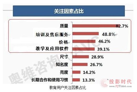 據(jù)AVC調查報告顯示,在多媒體教學裝備領域,用戶最關注的四個因素分別為質量、價格、售后服務(專業(yè)人員、反應速度)及配套軟件(豐富且應用方便),四種因素比例見下圖。