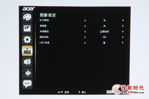 宏碁K135投影機(jī)菜單中,專門設(shè)置了投影設(shè)定菜單,可以對LED光源進(jìn)行設(shè)定,保證在不同環(huán)境下投射出滿意的效果。