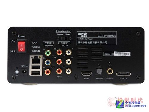 接口方面,碧維視BV8088Mpro的配置相當(dāng)齊全,從左到右以此為RJ45、USB 2.0、色差、5.1聲道、HDMI、光纖、同軸、E-SATA。其中5.1聲道直接輸出端口可連接音箱,省去了購買功放的額外花費。另外,碧維視BV8088Mpro還設(shè)計了獨立的硬開關(guān),這在同類產(chǎn)品中也是不多見的。