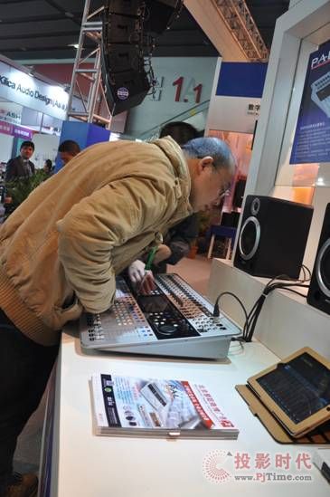 外國觀展嘉賓正在用Ipad體驗(yàn)用軟件對數(shù)字調(diào)音臺進(jìn)行遠(yuǎn)程調(diào)控