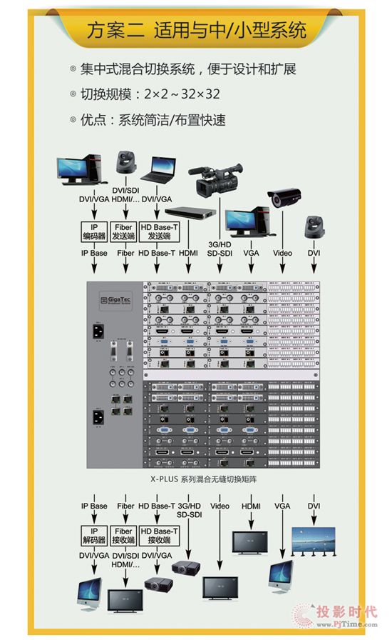 方案二:以多格式混合矩陣為核心,將不同格式的輸入信號直接連接到矩陣的輸入端,在矩陣內部實現信號格式轉換、切換,矩陣輸出時,在其內部也完成了相應的格式轉換,使得輸出信號格式可以匹配后級設備,如圖所示。