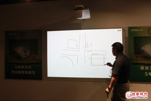 工作人員介紹,面對日益更新的教學(xué)環(huán)境,Vivitek麗訊最新開發(fā)出了超短焦投影的巔峰級產(chǎn)品D755WTi,這款產(chǎn)品綜合能力超群、品質(zhì)出眾,互動投影能力更是突破了目前的瓶頸,可以做到脫離電子白板,用雙筆同時書寫。