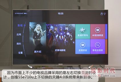 完成開機的引導(dǎo)設(shè)置之后,就進入電視的主要UI。這是一套上下切換不同功能區(qū)域的UI,和遙控器上的旋轉(zhuǎn)方向鍵搭配使用非常完美。PConline評價道:“市面上不少的電視品牌采用的是左右切換頁面的設(shè)計,創(chuàng)維E710U上下切換的天賜4.0系統(tǒng)給用戶操作帶來新鮮感!