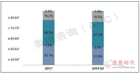 圖 1  2013-2014’Q1平板式IWB市場(chǎng)分尺寸銷量份額