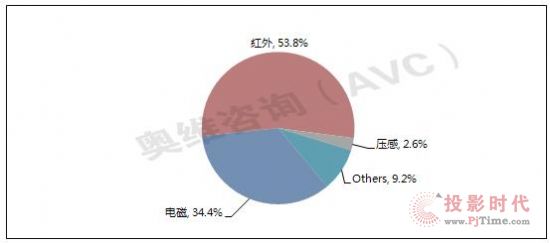 2013年,平板式IWB市場(chǎng)中LED背光產(chǎn)品占比已達(dá)96.8%,CCFL背光產(chǎn)品占比2.2%,PDP技術(shù)占比僅為0.9%。投影式IWB市場(chǎng)中紅外技術(shù)加速滲透,份額已達(dá)53.8%, 電磁技術(shù)占比34.4%,壓感及其他技術(shù)分別占2.6%、9.2%。