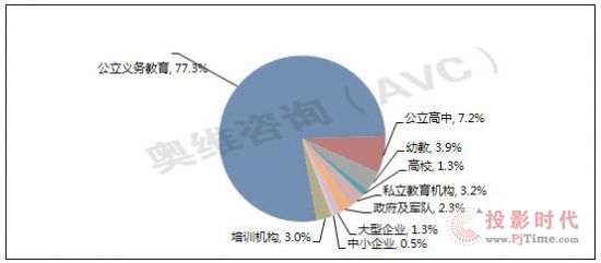 2014年一季度 ,平板式IWB仍以教育行業(yè)為主要行業(yè),銷售量占比85.7%,銷售額占比83.4%;商用市場(chǎng)銷售量占比14.3%,銷額占比16.6%,高于銷量份額。投影式IWB仍以教育行業(yè)為主要客戶群體,銷售量占比92.9%,銷售額占比92.0%;商用市場(chǎng)銷售量占比7.1%,銷額份額8.0%,比銷量份額略高。圖 4  2014’Q1平板式IWB市場(chǎng)分行業(yè)銷量份額