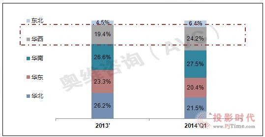 2014年一季度,平板式 IWB產(chǎn)品在華南區(qū)域占比最高,達(dá)27.5%,其次為華西、華北、華東區(qū)域。相較于2013年,華北、華東區(qū)域份額分別下降4.7、2.9個(gè)百分點(diǎn),華西區(qū)域份額提升4.8個(gè)百分點(diǎn)。投影式 IWB產(chǎn)品在華西區(qū)域的出貨量較高,占比27.6%。其次分別為華北、華南及華西區(qū)域,東北區(qū)域占比仍然較少。