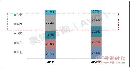 圖 9  2013-2014’Q1投影式IWB市場(chǎng)分區(qū)域市場(chǎng)銷量份額