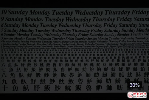 文字解析度測試,詩威黑翼三號表現(xiàn)尤為出色,在實際觀影中,投影出的文字非常易于辨別,中間最小的字體略只要稍微辨認(rèn)一下,即可讀出中文和英文詞。尤其是在亮度下降到30%的狀態(tài)下,中間最小的字體依然清晰可辨。